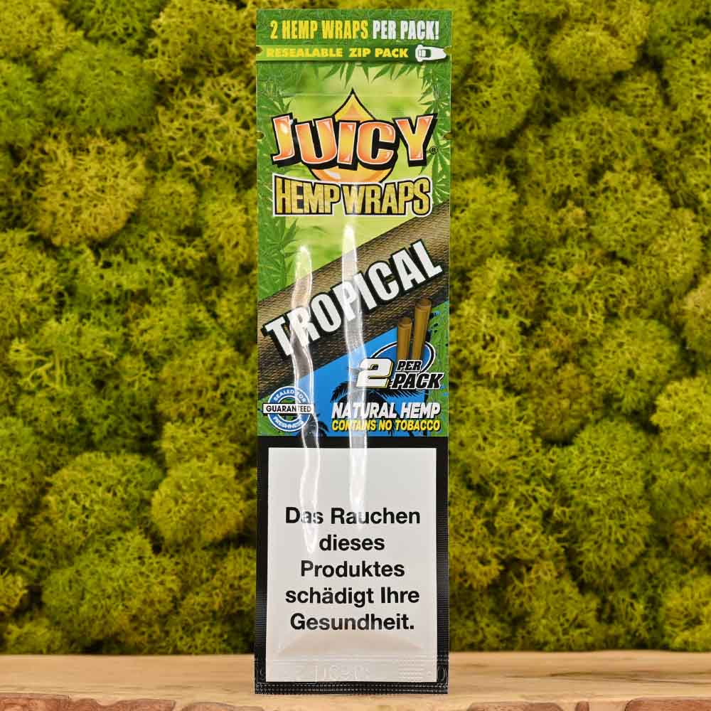 Juicy Hemp Wraps Tropical en Stoners Smoke Shop son wraps de cáñamo natural sabor tropical, sin tabaco ni nicotina. Ofrecen una combustión lenta y uniforme, con un sabor dulce y afrutado para una experiencia de fumar suave y deliciosa
